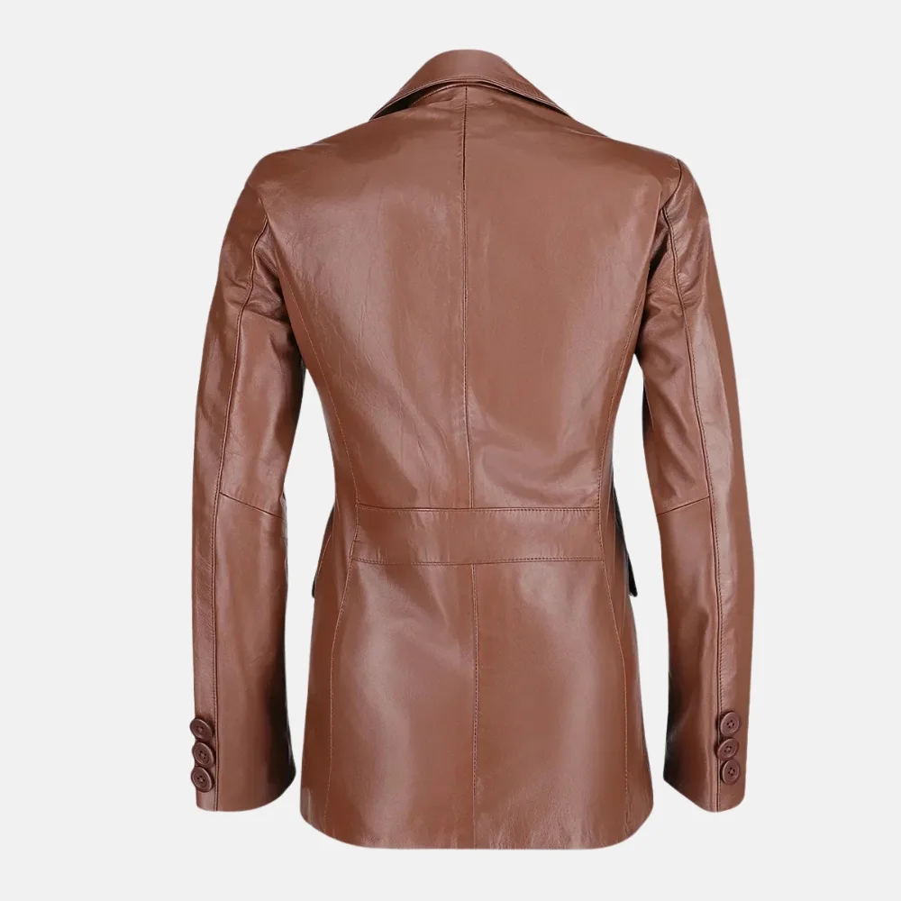 Buy Amelia Women’s Brown Two Button Leather Blazer Jacket with Notch Collar Now On Sale