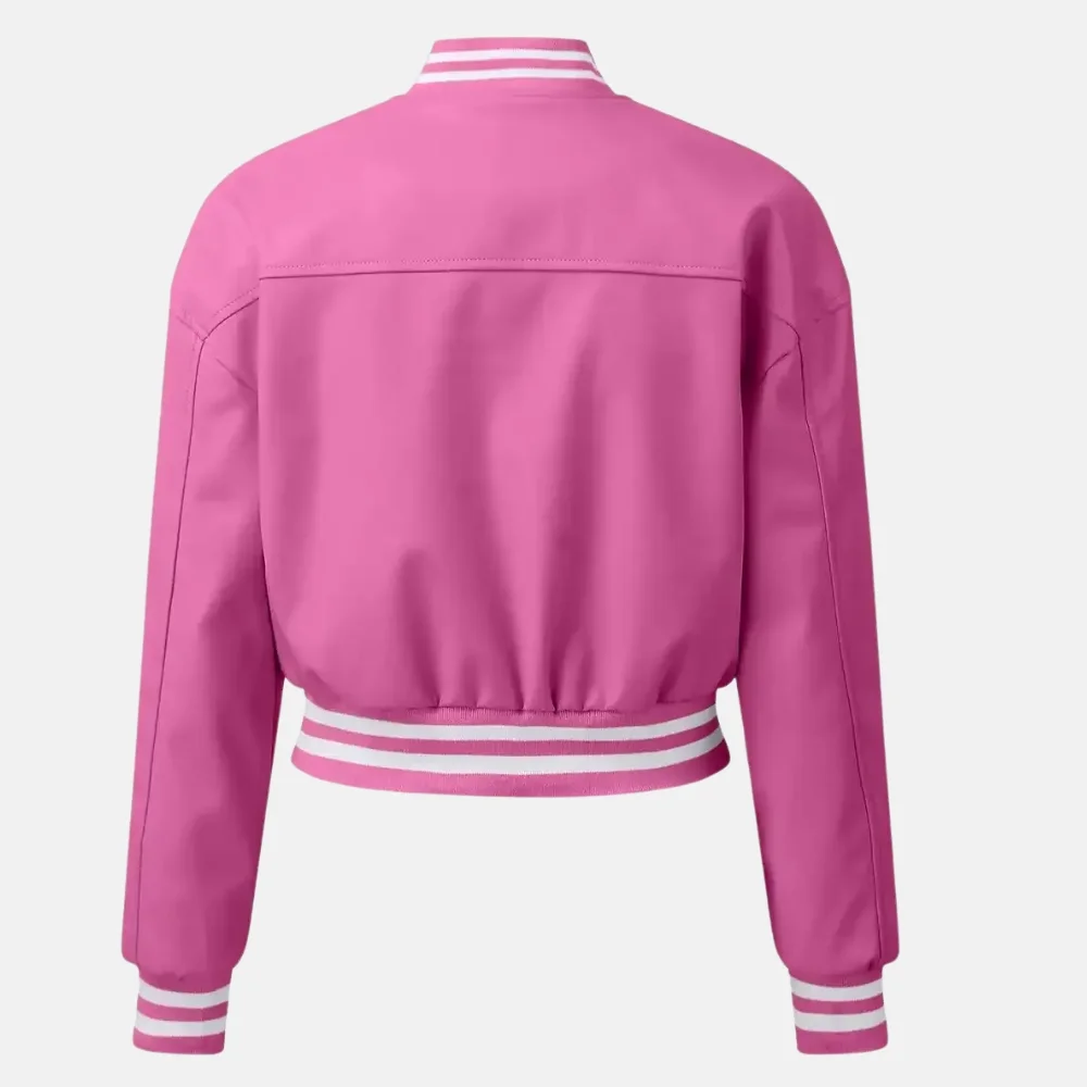 Chloe Women’s Pink Leather Varsity Jacket with Ribbed Sleeves