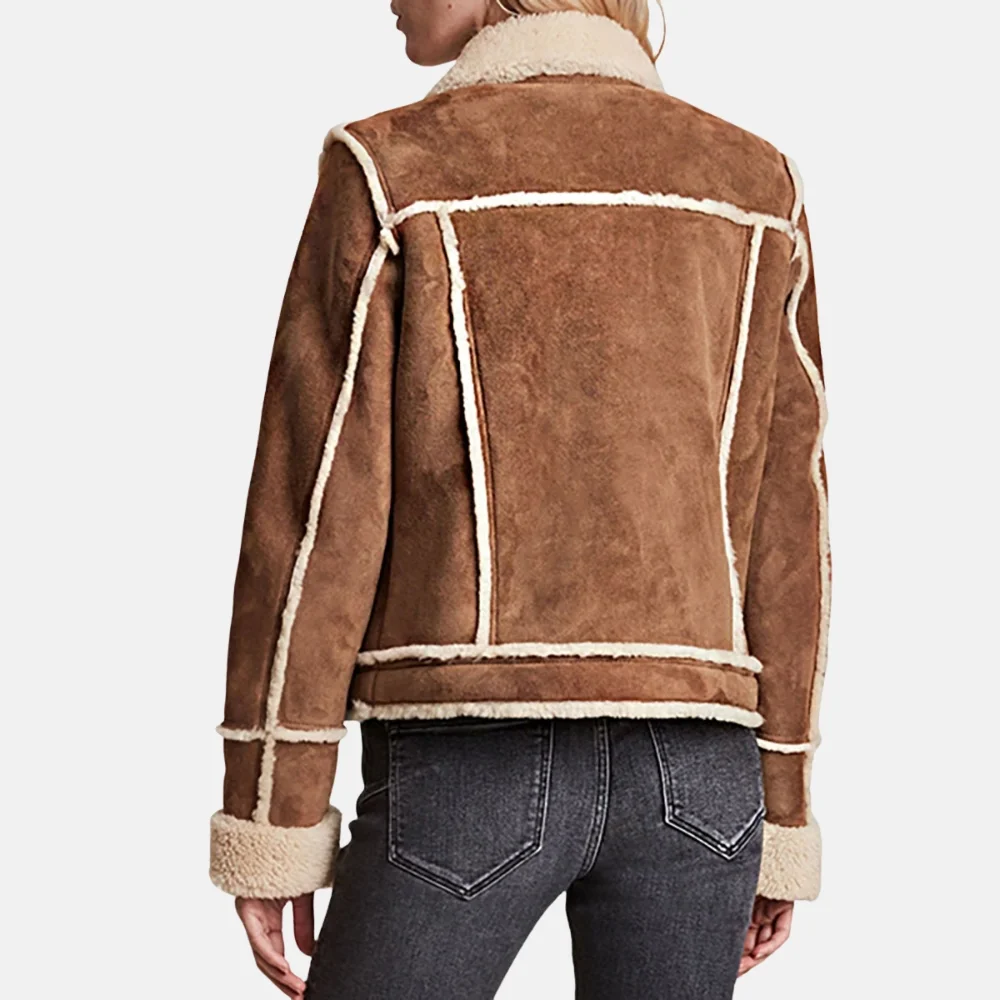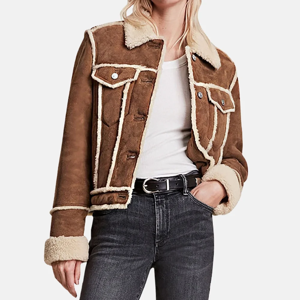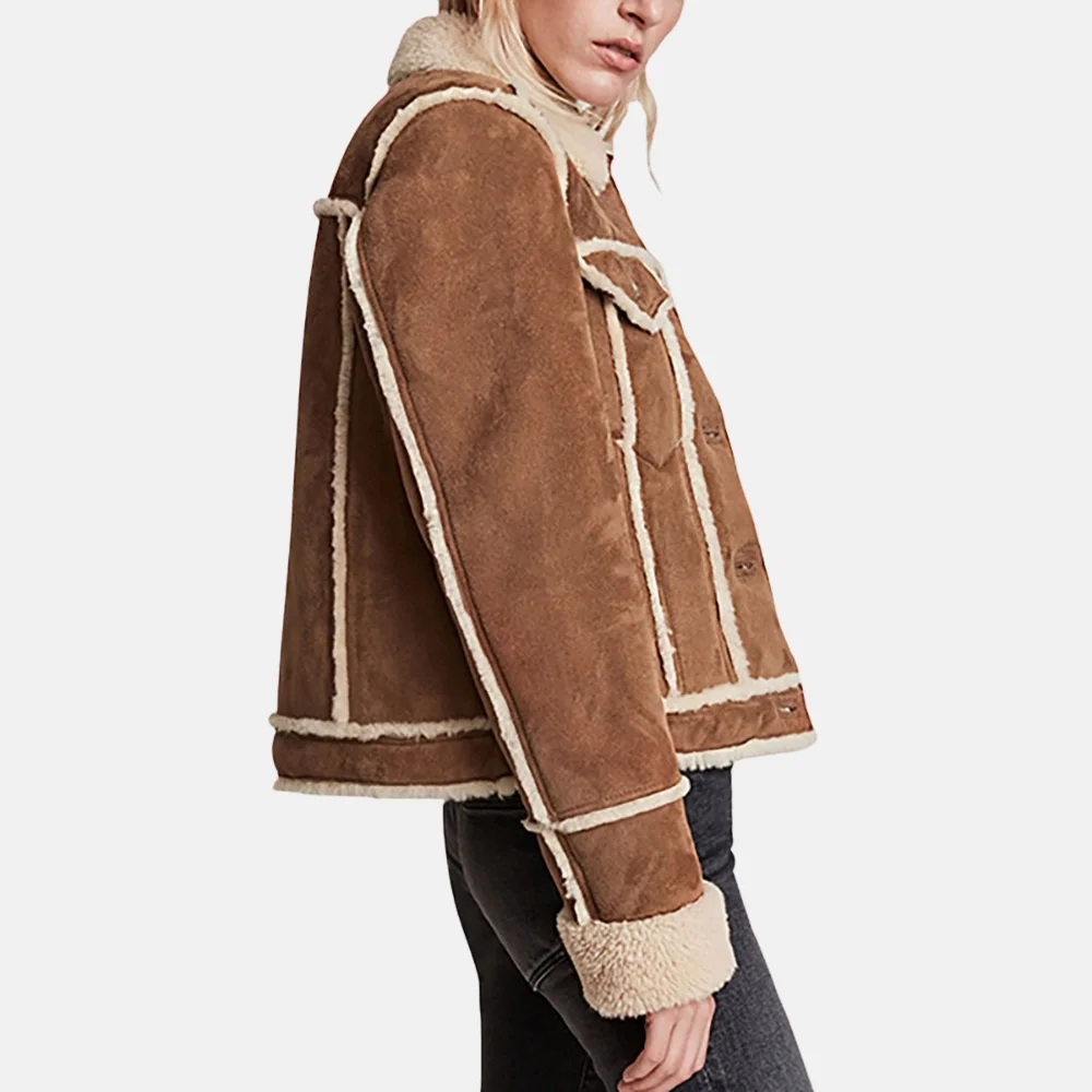Buy Lily Women’s Tan Shearling Leather Trucker Jacket with Button Detail Now On Sale