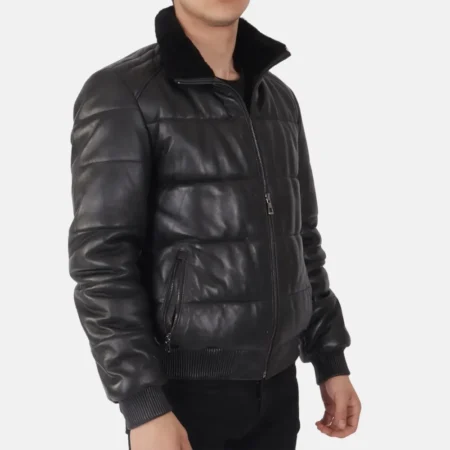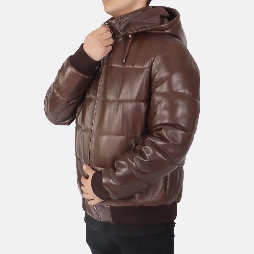 Matthew Men’s Brown Hooded Puffer Leather Jacket for Outdoor Adventures