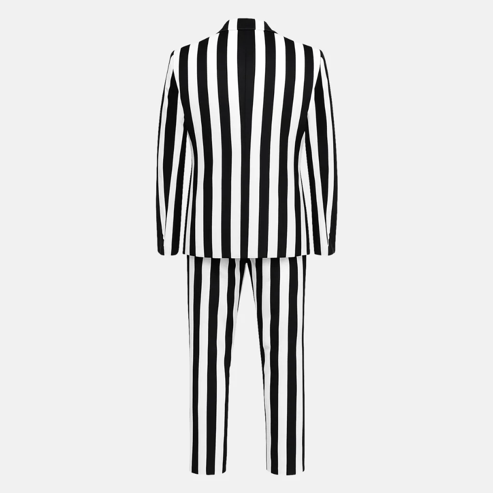 Every stripe is meticulously aligned to achieve that signature Beetlejuice contrast — crisp black and white panels that command attention under any light. With three external pockets and two internal compartments, the jacket pairs theatrical design with practical function. The matching striped pants, complete with two waist and two back pockets, provide a seamless, polished finish. Together, they create a bold silhouette that’s instantly recognizable, unapologetically eccentric, and endlessly stylish.