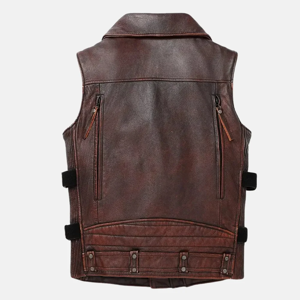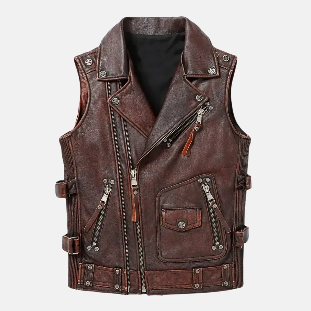 Buy Owen Men’s Asymmetrical Zipper Brown Vintage Biker Leather Vest Now On Sale