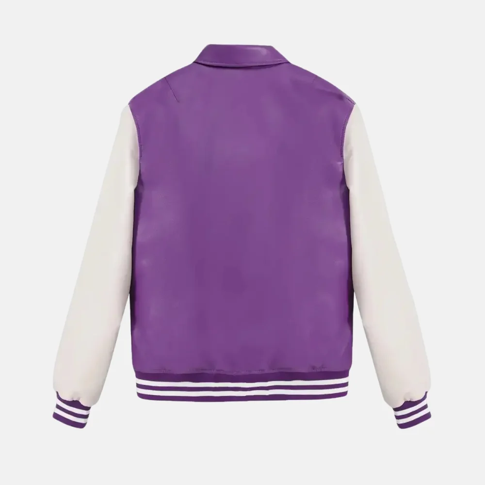 Zoe Women’s Purple and White Leather Varsity Jacket with Pockets